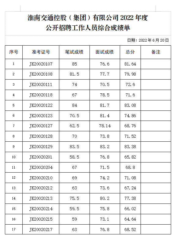 淮南交通控股(集團(tuán))有限公司公開招聘工作人員面試于2022年6月18日舉行,現(xiàn)將筆試+面試綜合成績公示如下(詳見附件),咨詢電話:0554-6299918。