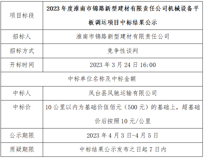 2023年度淮南市錦路新型建材有限責(zé)任公司機(jī)械設(shè)備平板調(diào)運(yùn)項(xiàng)目中標(biāo)結(jié)果公示