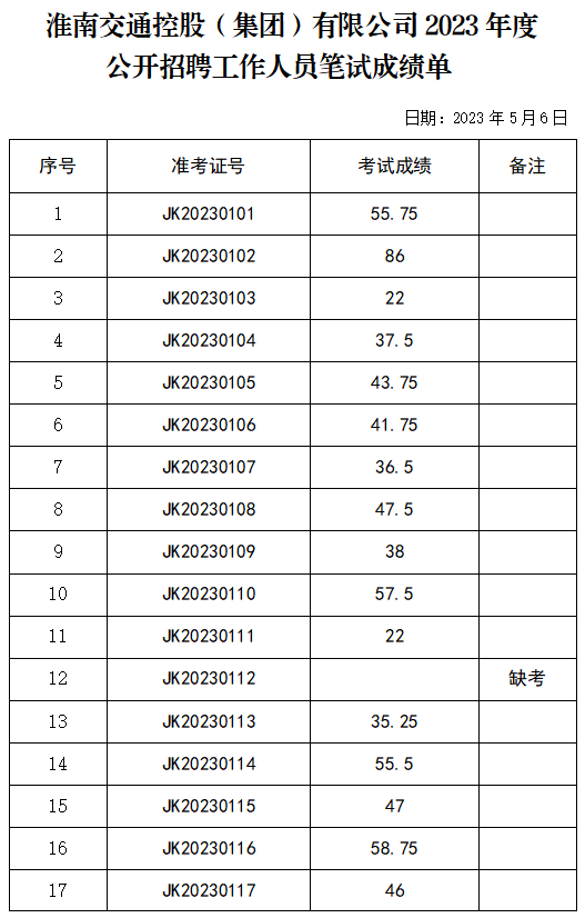 淮南交通控股(集團)有限公司公開招聘工作人員筆試于2023年4月29日舉行,現(xiàn)將筆試成績公示如下(詳見附件),面試對象、時間、地點等相關事宜另行通知。咨詢電話:0554-6299918。