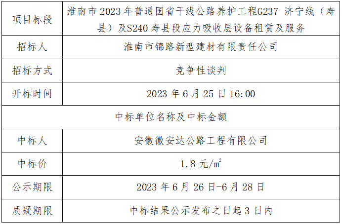 淮南市2023年普通國省干線公路養(yǎng)護(hù)工程G237 濟(jì)寧線(壽縣)及S240壽縣段應(yīng)力吸收層設(shè)備租賃及服務(wù)中標(biāo)結(jié)果公示