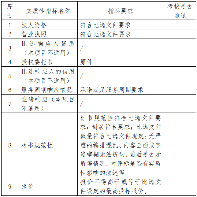9、評委獨立評審后,評標(biāo)委員會對比選響應(yīng)人某項指標(biāo)如有不同意見,按照少數(shù)服從多數(shù)的原則,確定該項指標(biāo)是否通過。符合評審指標(biāo)全部通過標(biāo)準(zhǔn)的,為有效投標(biāo)。